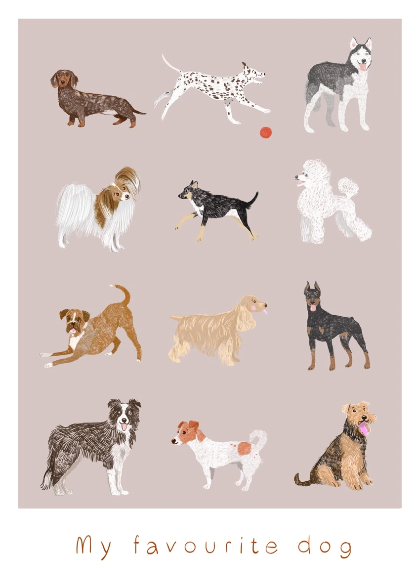 Dwanaście psów, dwanaście charakterów i zero złych dni. „My Favourite Dog I” to radosny, ręcznie rysowany plakat, który wnosi do wnętrza lekkość, humor i ciepło. Idealny dla wszystkich, którzy kochają psy — i dobre towarzystwo na ścianie.
