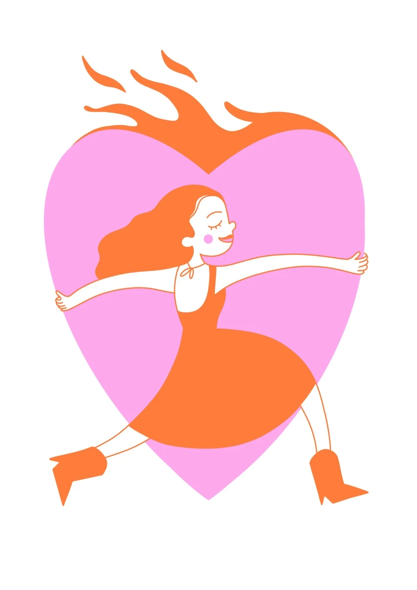 Dynamiczna sylwetka biegnącej kobiety i płomień serca są metaforą działania zgodnego z intuicją. Kolory — mocny, energetyczny pomarańcz oraz miękki róż — zostały dobrane tak, by wnosiły ciepło, ruch i optymizm do każdego wnętrza. To styl charakterystyczny dla Kasi: prosta forma, dużo emocji i kobieca lekkość, która nie jest przesłodzona, lecz prawdziwa i codzienna.